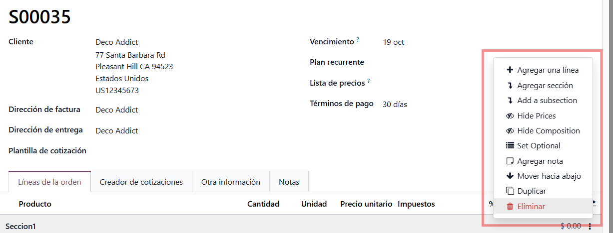 En Odoo 19, los documentos de cliente (como presupuestos, órdenes de venta y facturas) ahora permiten manejar secciones inteligentes, con mayor control sobre su presentación, visibilidad y formato.