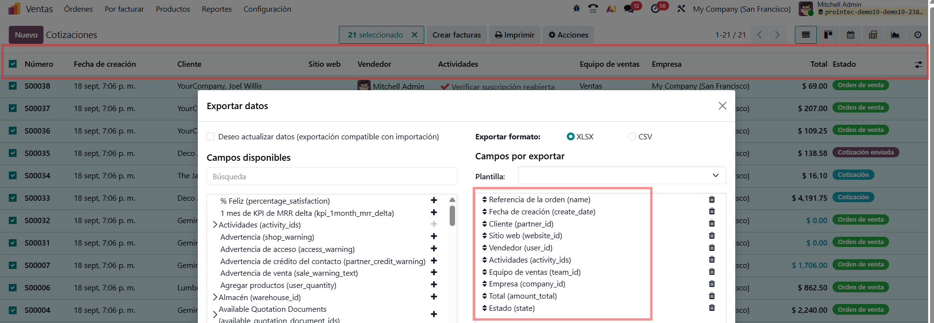 En la pantalla de exportación, los campos predeterminados y su orden de visualización ahora coinciden con la vista de lista subyacente