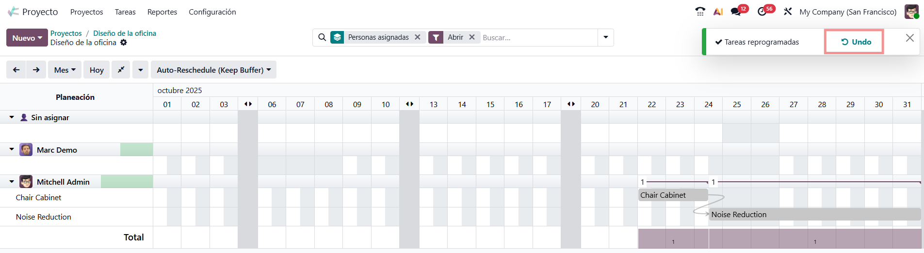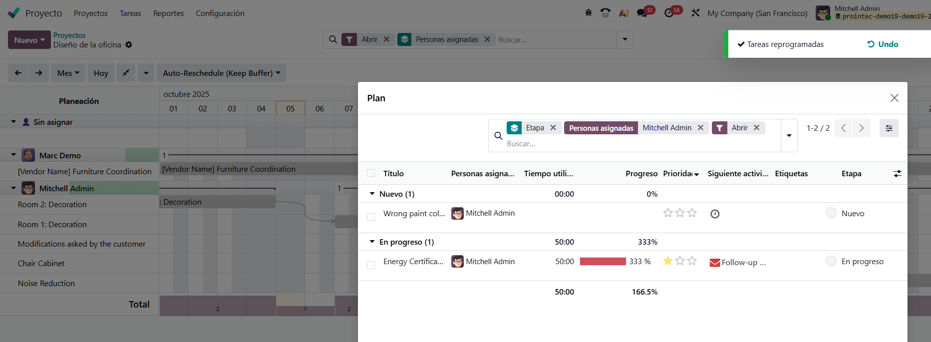 - Cuando la vista de Gantt está agrupada, los datos se filtran automáticamente al planificar un registro dentro de ese grupo. Por ejemplo, si agrupas las tareas en la vista de Gantt por persona asignada y planificas para un usuario específico, el diálogo solo mostrará ahora las tareas no planificadas de ese usuario.