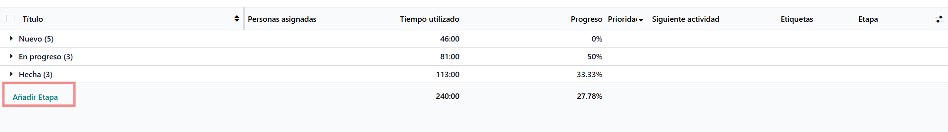 - Si los registros están agrupados por defecto en la vista de lista, puedes crear nuevos grupos mediante el enlace que aparece al final de la lista (p. ej. añadir nuevas fases desde la lista de tareas).