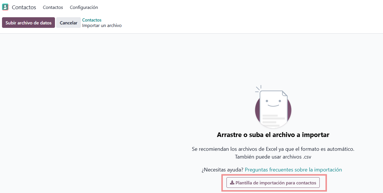 Se han agregado nuevas plantillas de importación para los registros más comunes, como contactos, clientes potenciales, pedidos de venta, órdenes de compra, asientos contables, tareas, hojas de horas, etc.